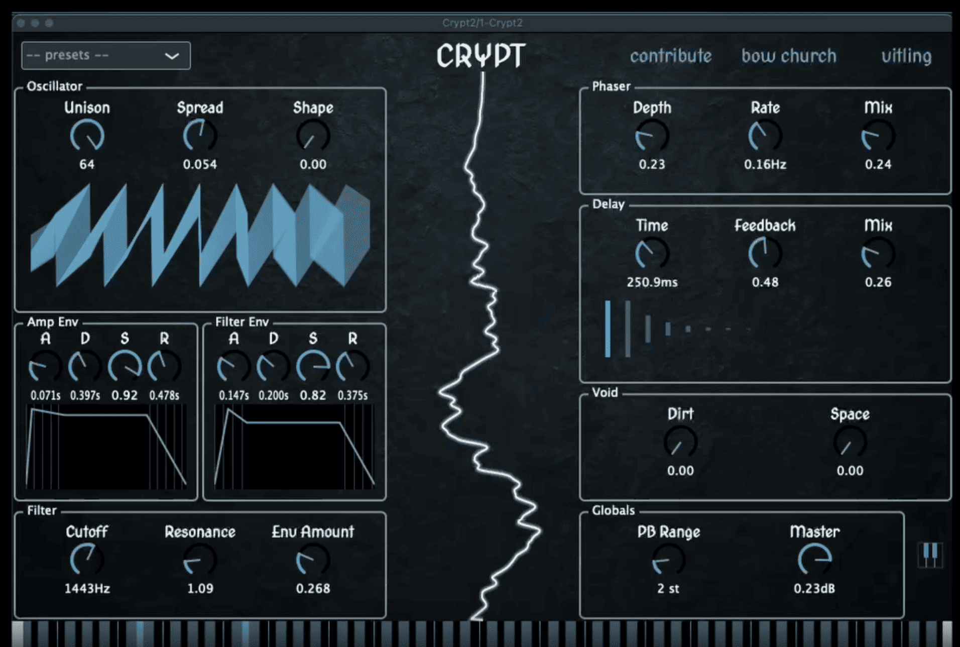 Crypt is a hyper-unison synthesizer plugin designed for creating spacious cold synth sounds, perfect for witch house, trance, ambient, hardcore and EBM genres.